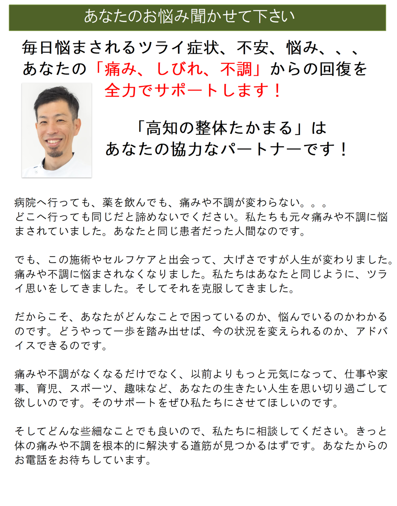 私と同じように痛いのが当たり前で、体の不調があることで趣味を存分に楽しめない、生きがいを諦めている人が充実した生活を送れるよう、安心できる日常生活をとりもどせるよう全力でサポートすることをお約束します。
